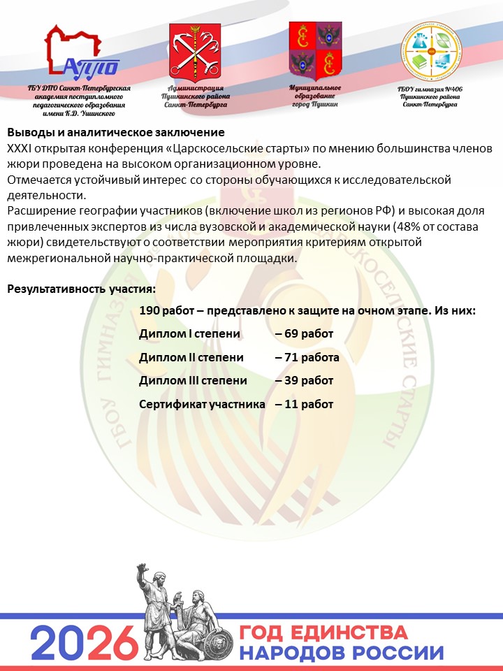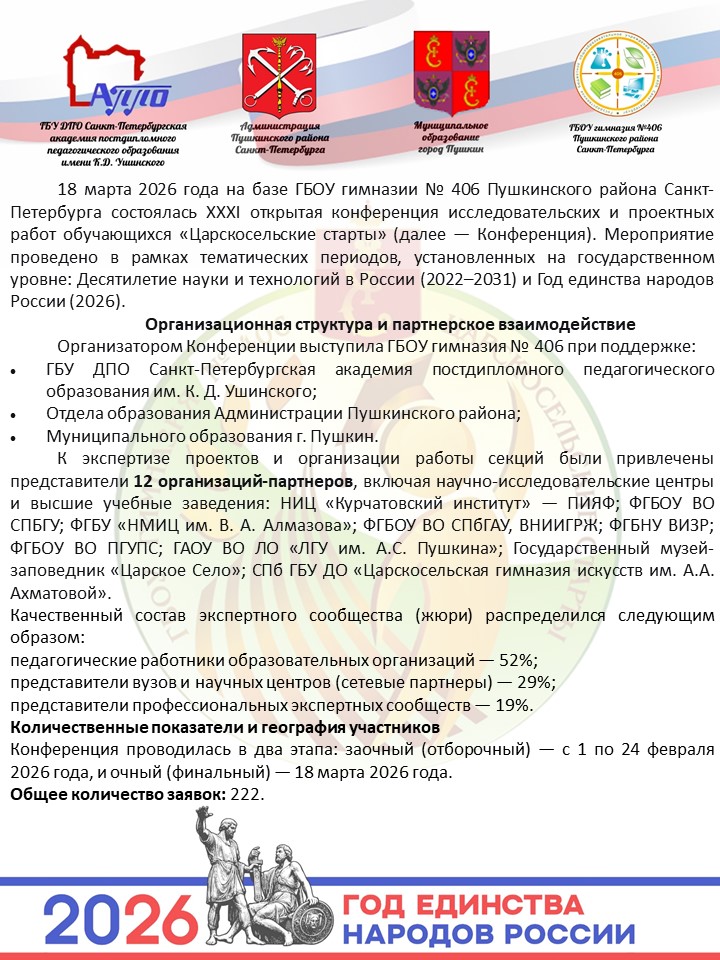 Подведены итоги XXXI открытой конференции исследовательских и проектных работ обучающихся «Царскосельские старты» . Ознакомиться с итогами можно по ссылке https://gymnasium406.ru/carskoselskie-starty