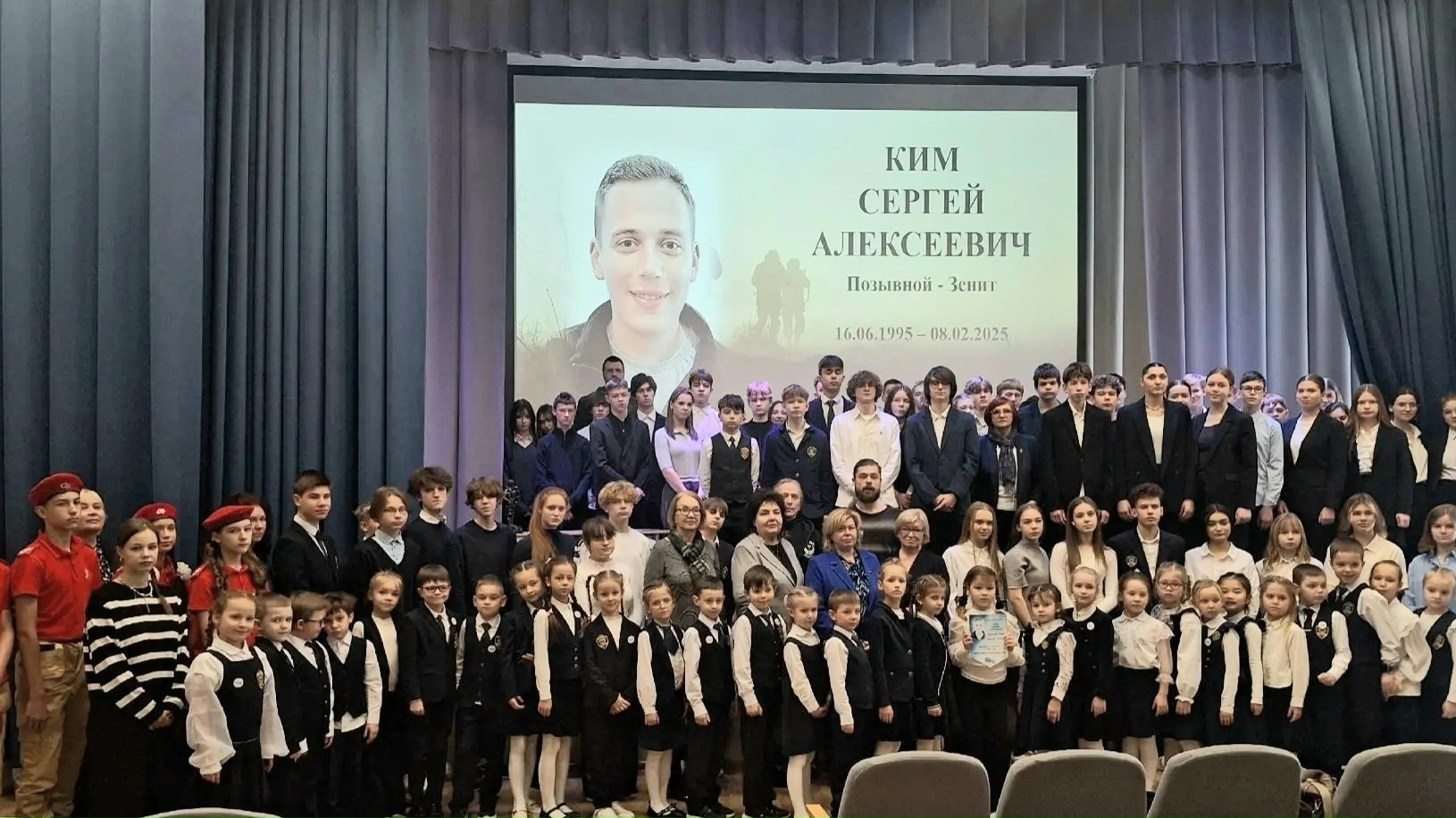 Сегодня в гимназии состоялось мероприятие, посвящённое памяти выпускника нашей гимназии 2010 года Сергея Алексеевича Кима, (позывной-Зенит), погибшего на СВО ровно год назад. На встрече присутствовали мама и папа Сергея, первый учитель Наталья Владимировна Неделько, классный руководитель старшей школы Елена Владимировна Пантюхова, а также одноклассники Сергея.Вымпел памяти Героя и почётное звание "Кимовцы" получили ученики 1А класса. В гимназии всегда будут помнить нашего выпускника.