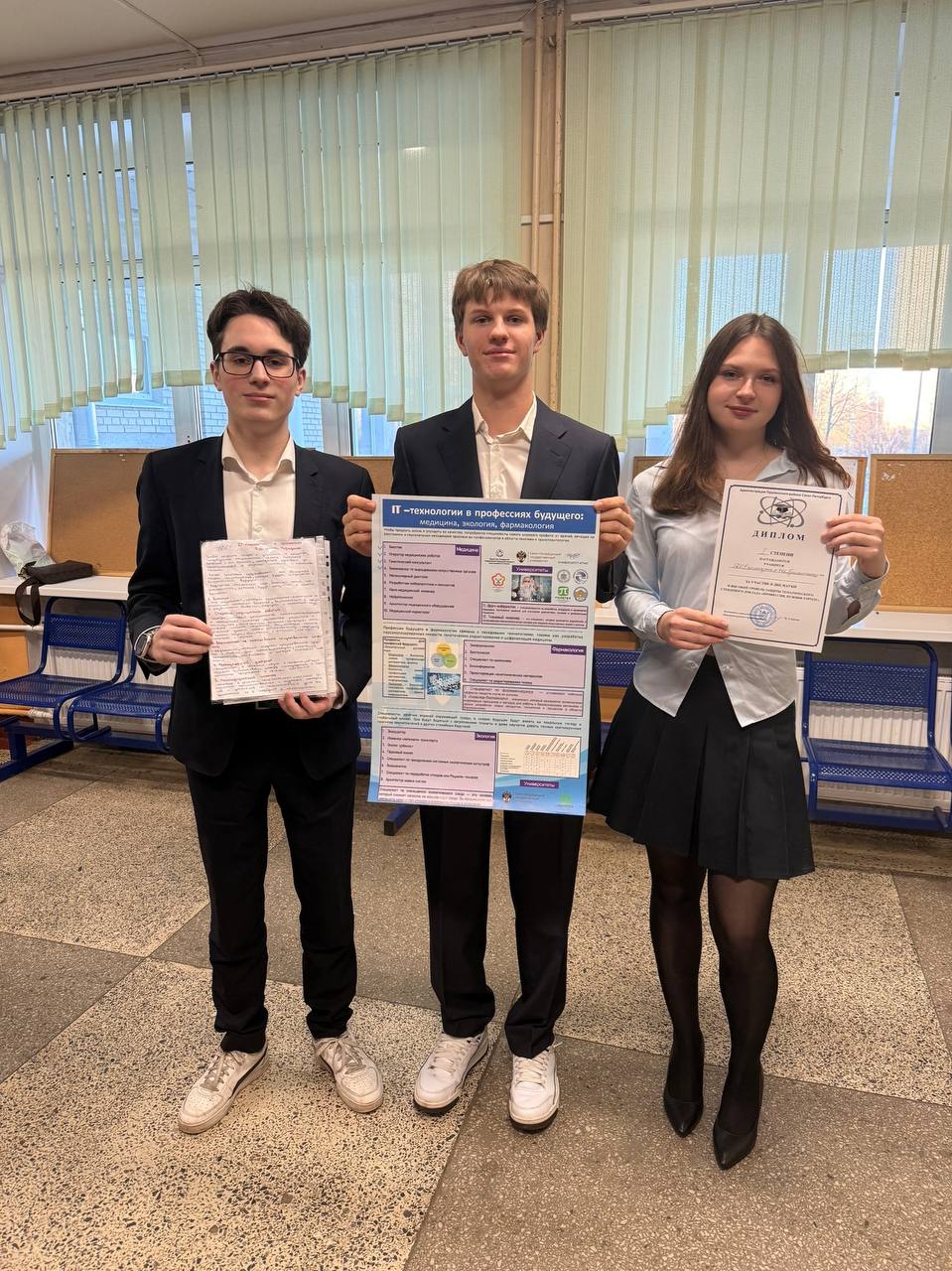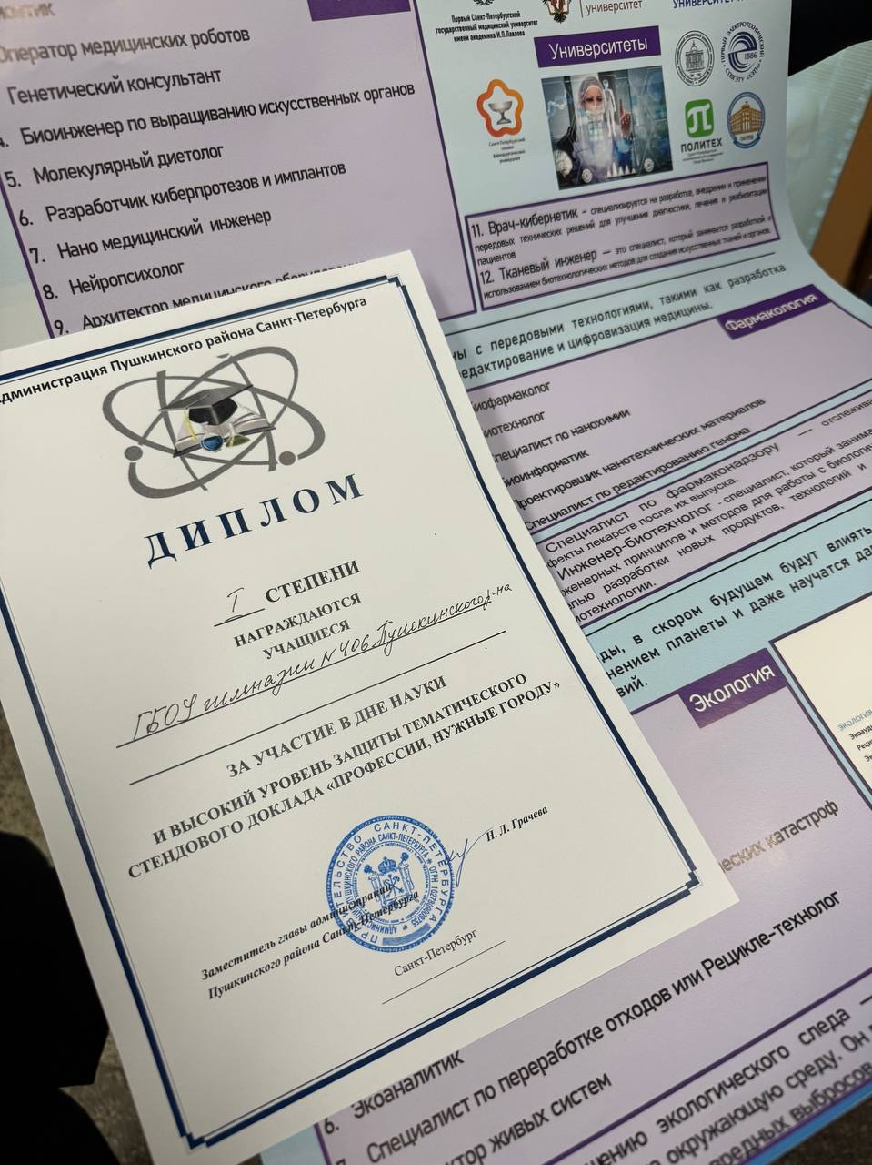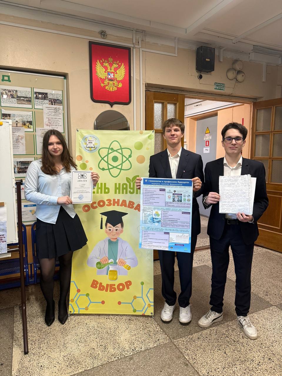 Победители открытой районной проектно-профориентационной конференции для старшеклассников, учителей, родителей «День науки», организованного Администрацией Пушкинского района Санкт-Петербурга на базе ГБОУ лицея № 408 Пушкинского района Санкт-Петербурга, со стендовым докладом «Профессия биотехнолог: перспективы в современной экономике»