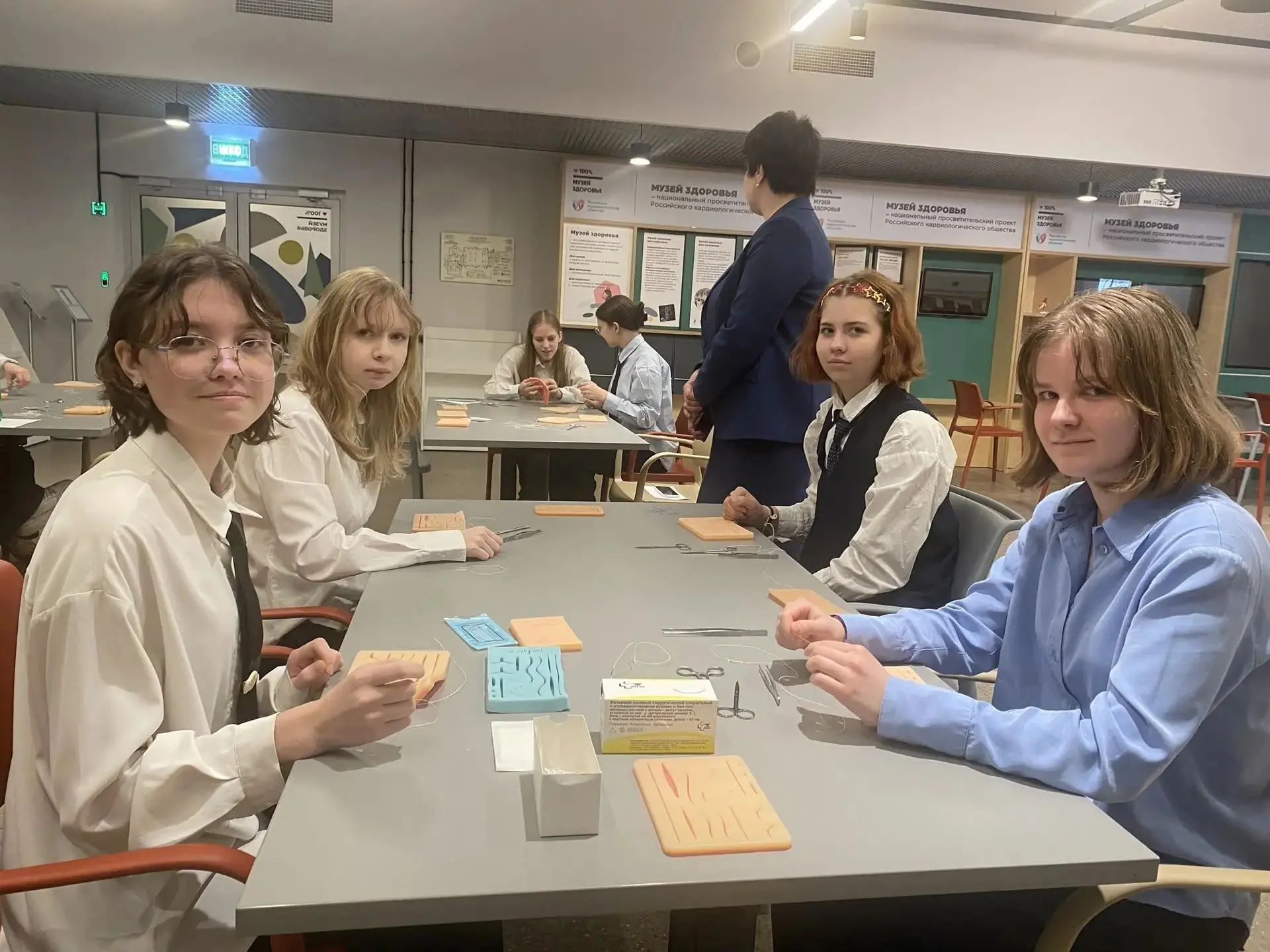 Ученики 9-х и 10.1 Курчатовского классов стали участниками профориентационного мероприятия, организованного ФГБУ "НМИЦ им. В. А. Алмазова" Минздрава России, в рамках которого ребята прослушали информацию о создании Центра и поучаствовали в мастер-классе: учились накладывать швы, пользоваться медицинскими инструментами.