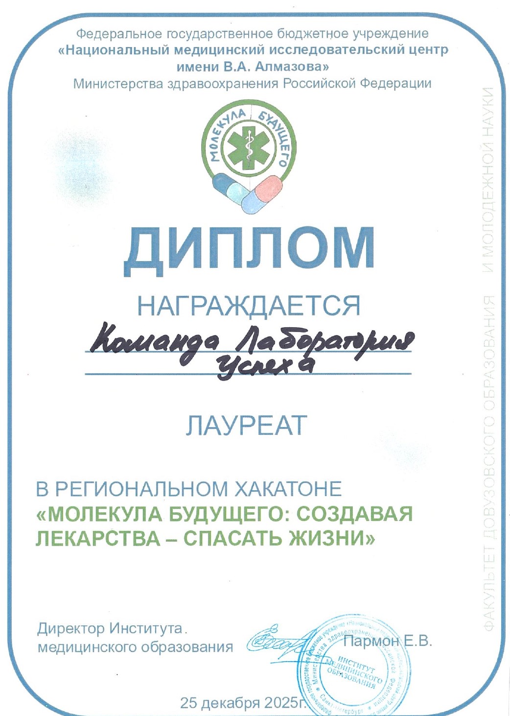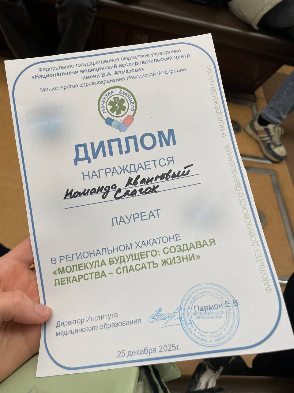 Ученики 10.1 Курчатовского класса — лауреаты регионального хакатона «Молекула будущего: создавая лекарства — спасать жизни» на базе ФГБУ НМИЦ имени В.А.Алмазова.
