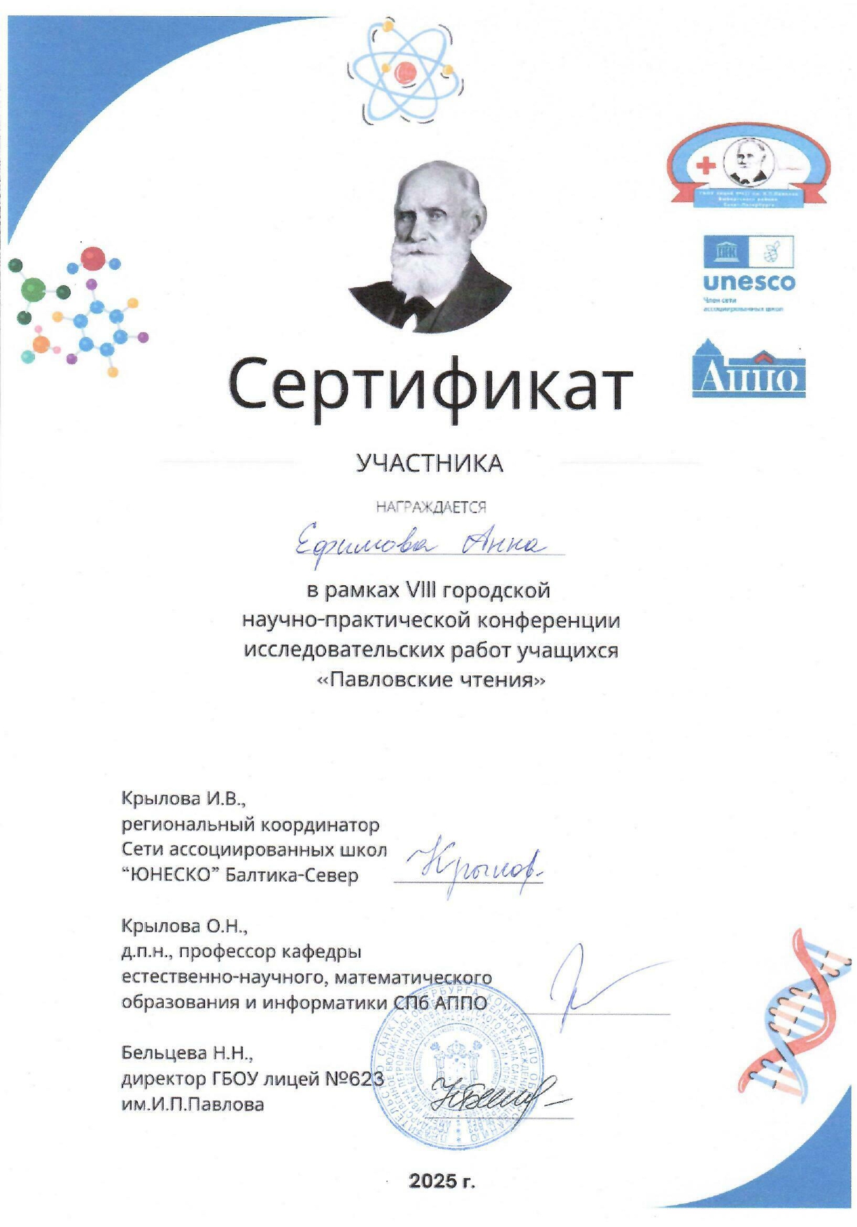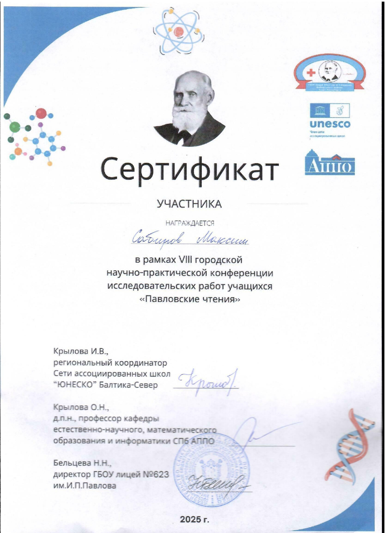 Участие в VIII городской научно-практической конференции исследовательских работ учащихся «Павловские чтения» в рамках III городской недели химии и биологии, организованной Комитетом по образованию и Химико-фармацевтическим университетом. Партнерами конференции выступили: Кванториум Санкт-Петербург, Академия цифровых технологий, СЗГМУ им. И.И. Мечникова Минздрава России, Педиатрический университет, Химико-фармацевтический университет, Санкт-Петербургский медико-социальный институт, СПб АППО имени К.Д. Ушинского.