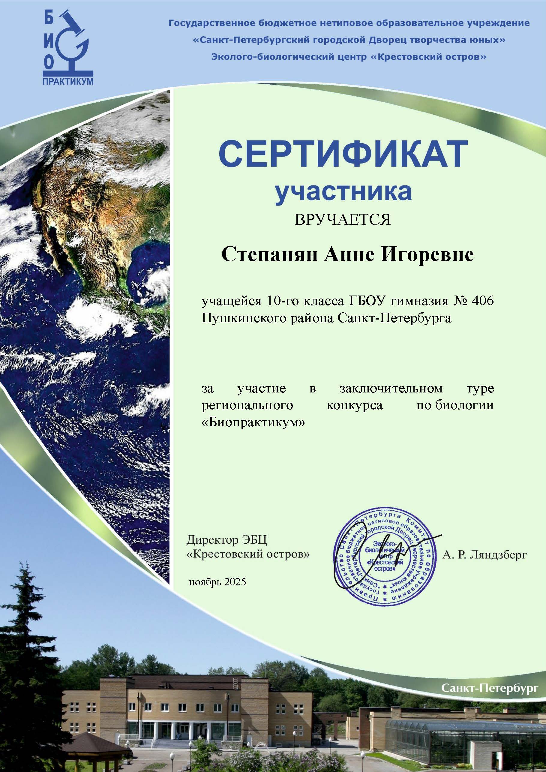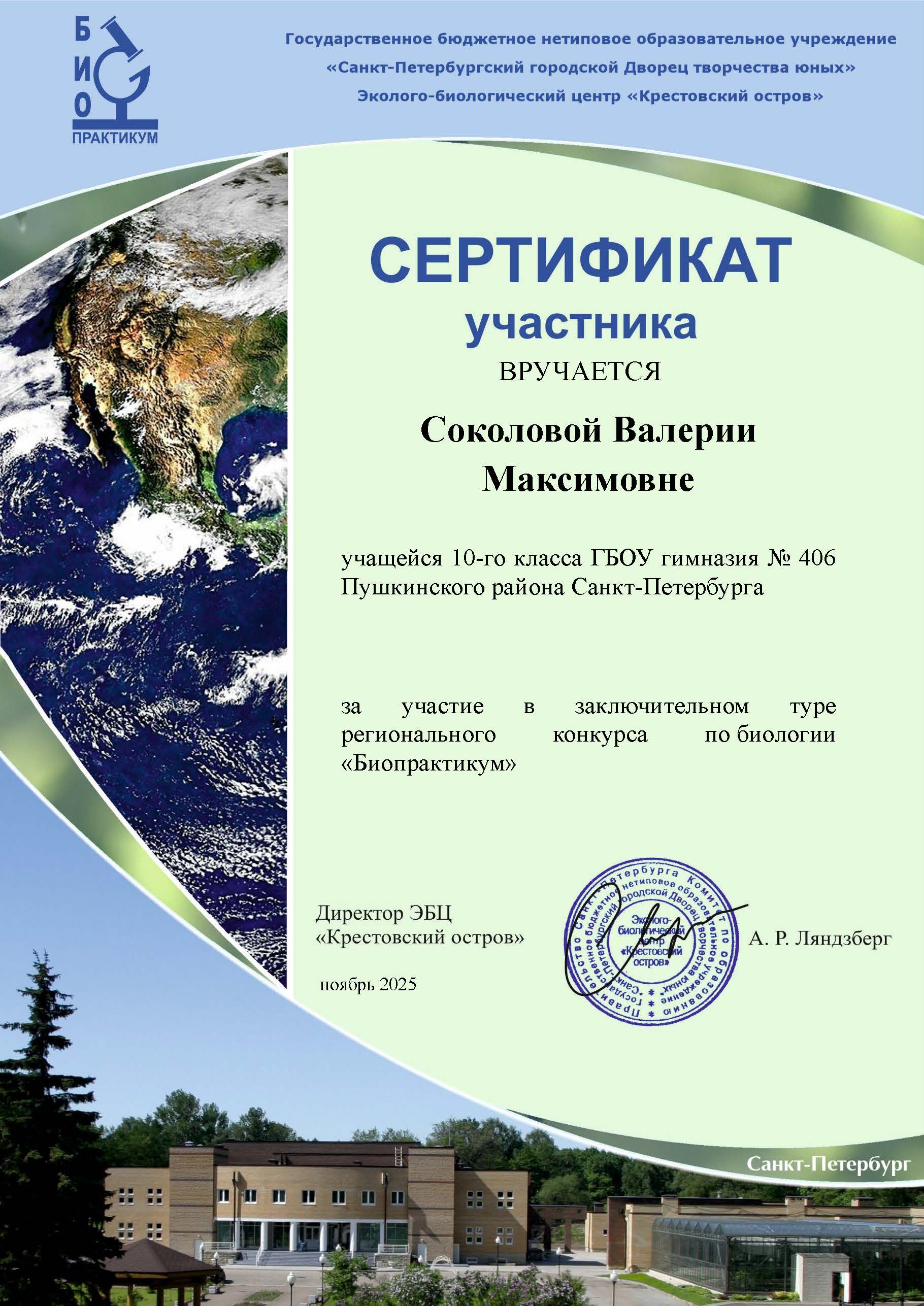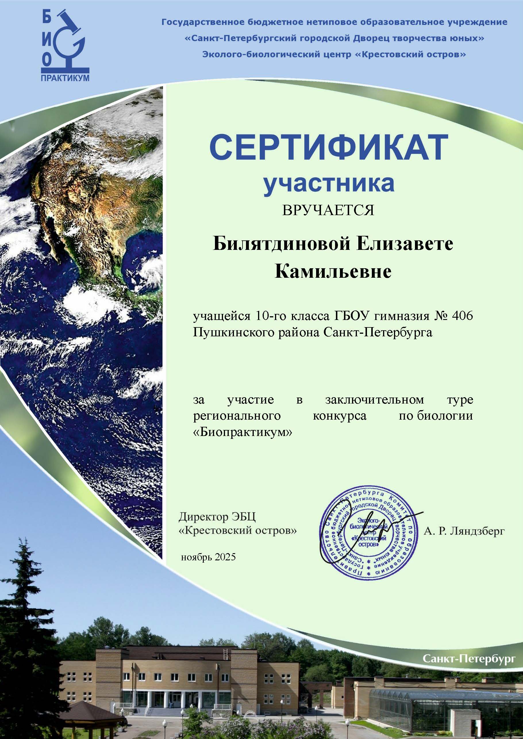 Призеры в командном составе и в личном первенстве16 регионального конкурса по биологии «Биопрактикум», организованного ГБНОУ «Санкт-Петербургский городской дворец творчества юных» Эколого-биологический центр «Крестовский остров»