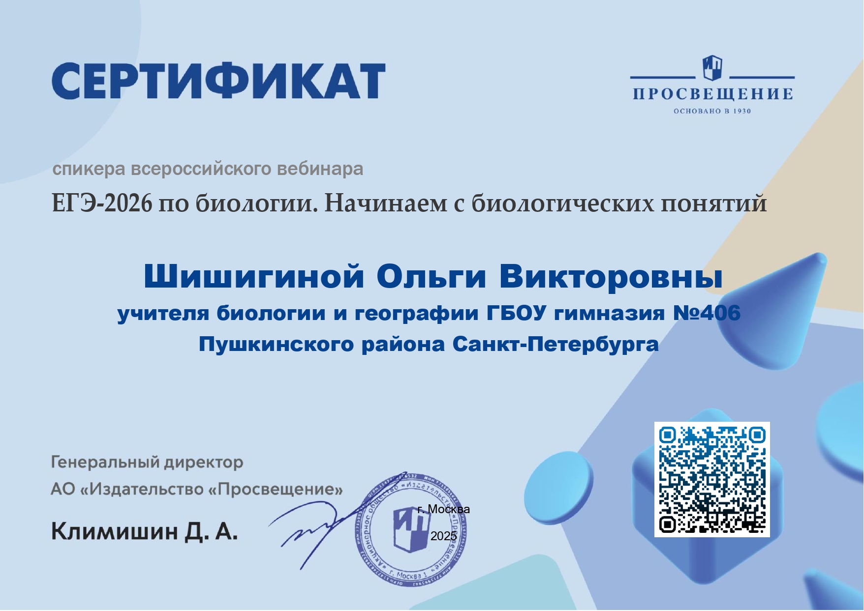 Учитель биологии и географии высшей категории О.В.Шишигина выступала в качестве спикера на на Всероссийских вебинарах ЕГЭ-2025 по биологии «Задания линий 25, 26: правила выполнения на максимальный балл» и «ЕГЭ-2026 по биологии. Начинаем с биологических понятий», организованных АО «Издательство Просвещение» (г. Москва)