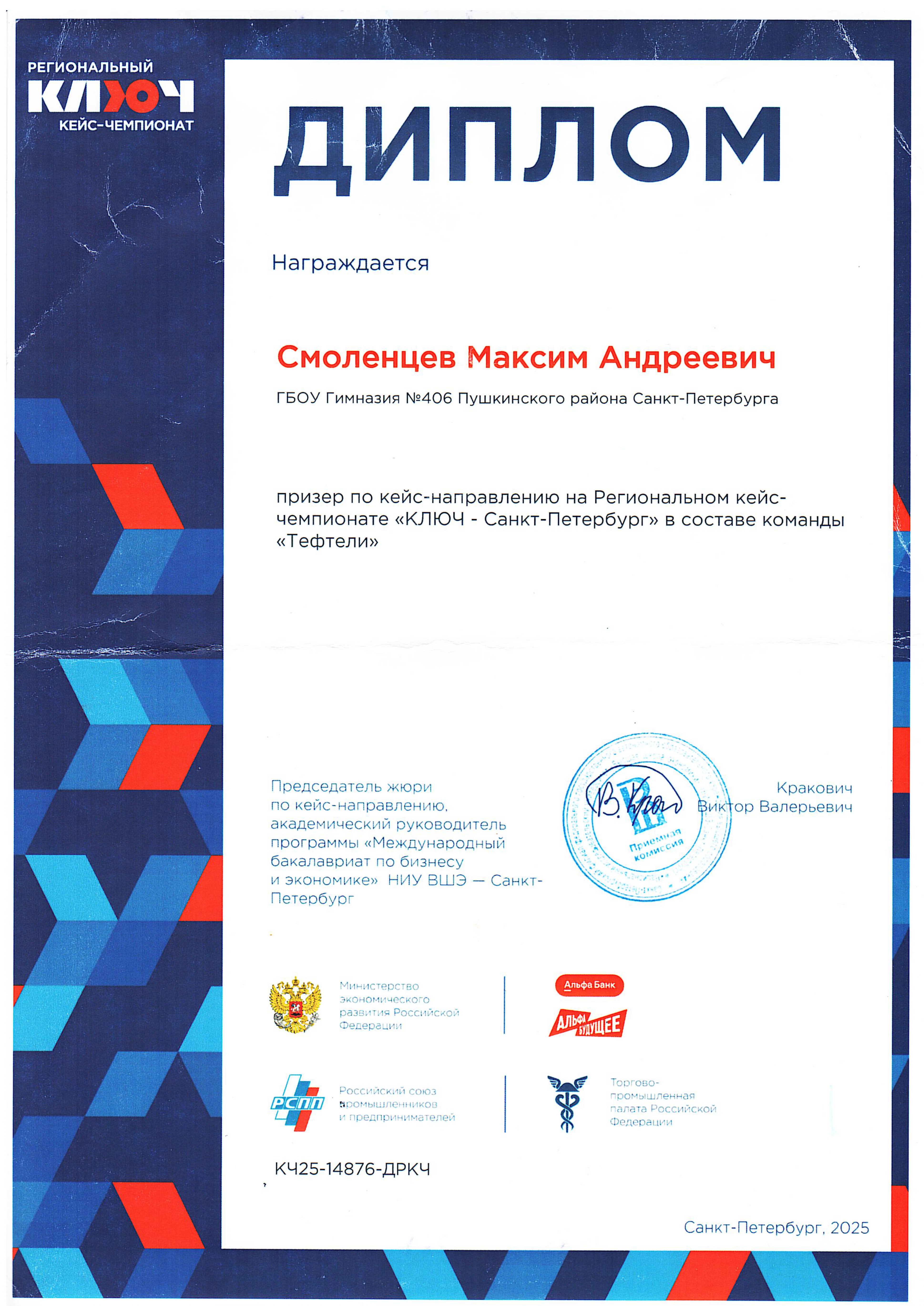 Призер по кейс-направлению на Региональном кейс-чемпионате «КЛЮЧ-Санкт-Петербург» на базе НИУ ВШЭ Санкт-Петербурга. Всероссийский кейс-чемпионат «КЛЮЧ» — это состязание, в котором команды участников при поддержке менторов решают реальные бизнес-задачи, разрабатывают собственные проекты и получают профессиональную оценку экспертов от бизнес-структур, вузов и органов власти.