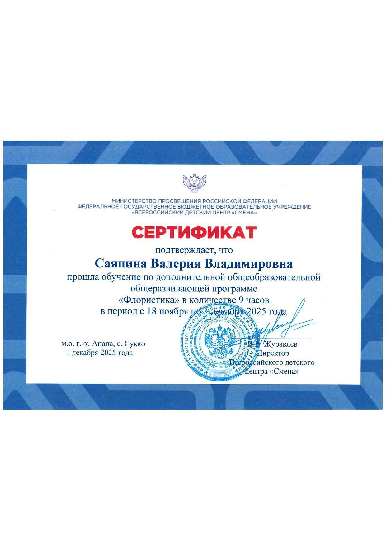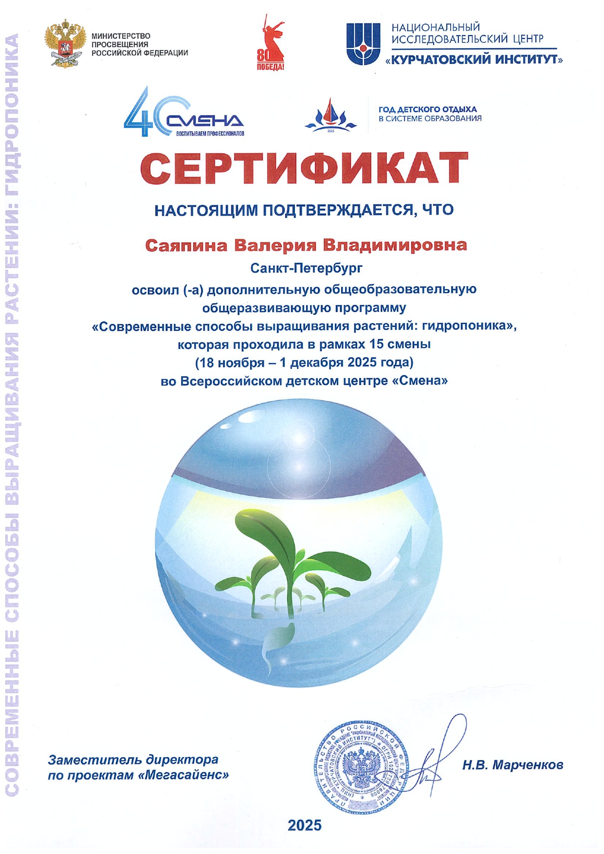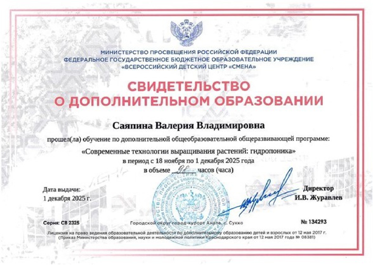 Ученица 10.1 курчатовского класса Саяпина Валерия стала победителем конкурсного отбора НИЦ «Курчатовский институт» на получение путевки во Всероссийский детский центр «Смена». В ходе 15 тематической смены освоила ДООП «Современные способы выращивания растений: гидропоника». Прошла обучение по программе «Современные технологии выращивания растений: гидропоника» (98 часов), «Флористика» (9 часов). Награждена дипломом за активное участие в творческой жизни лагеря.